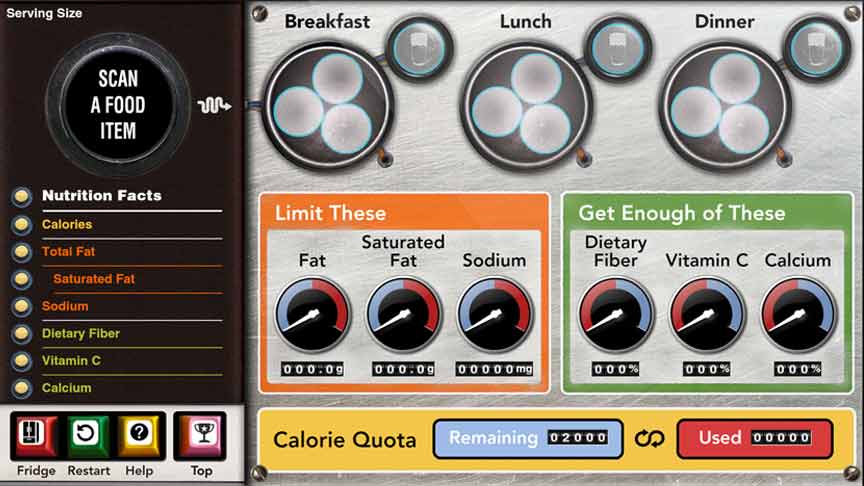 in their daily meal plan. Real-time gauges and meters indicate how well the meal plan scores in nutritional value.Visitors who choose wisely are entered